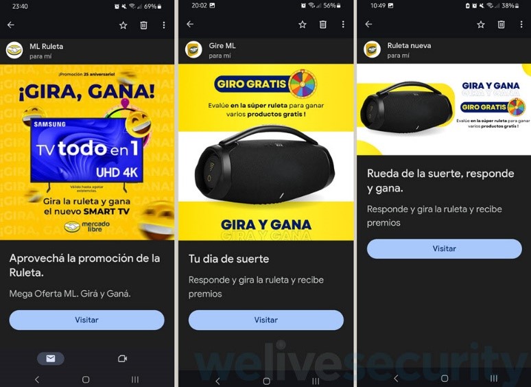 Los remitentes de estos correos electrónicos incluyen nombres como “ML ruleta”, “Ruleta Nueva”, “Gire ML”, “ML Online”, y utilizan el logotipo y los colores característicos de la marca, para generar confianza haciéndose pasar por MercadoLibre. En los tres casos identificados, figuran empresas brasileñas como anunciantes de los correos y no MercadoLibre.
