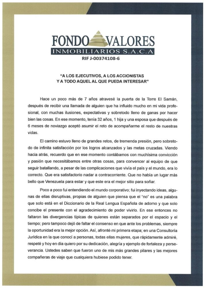DOBLE LLAVE – Hace más de siete años, Luis García Armas, comenzó su andar por la Torre El Samán, sede corporativa del emblemático Fondo Valores Inmobiliarios SACA, lleno de ilusiones y con la misión de superar retos así como alcanzar metas en medio de las dificultades del país. Con 32 años, una hija y una esposa que aceptó acompañarlo en este viaje, Luis se enfrentó a un mundo corporativo complejo pero lleno de oportunidades, comenta y resume en un profesional y emotivo mensaje, dirigido como es natural a ejecutivos y accionistas del FVI y a todo aquel al que pueda interesar.
