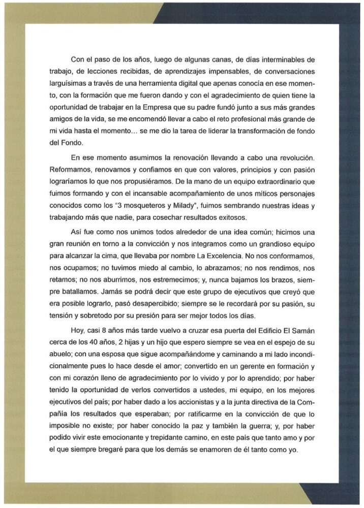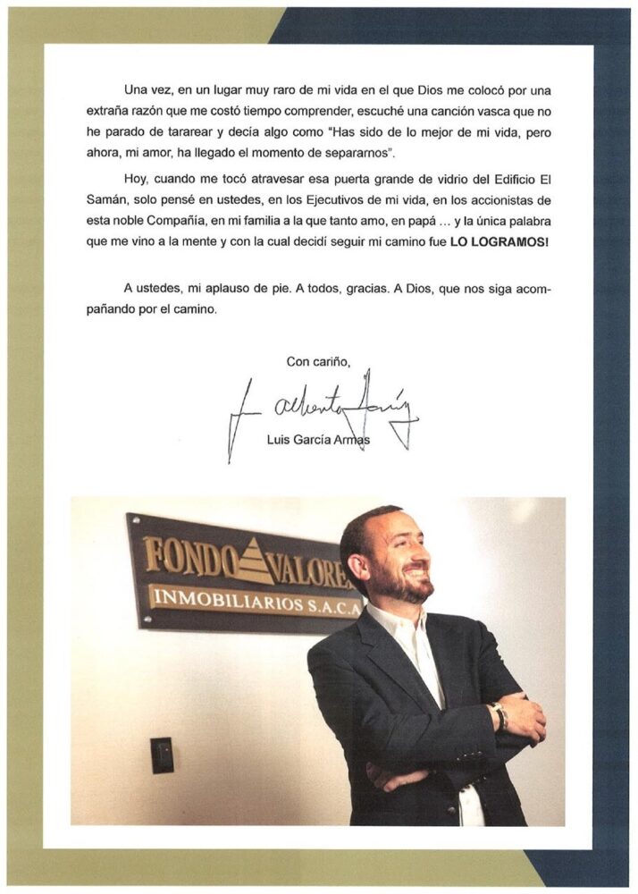 Este alto ejecutivo -pragmático y bien formado, retador, pero nada distante de la caballerosidad- concluye brindando a la mencionada comunidad del Fondo Valores Inmobiliarios su aplauso de pie. «A todos, gracias. A Dios, que nos siga acompañando». Con cariño, Luis García Armas, firma al final del documento.