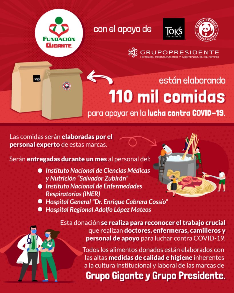Como parte de su compromiso en materia de Responsabilidad Social (RS) y ante la situación derivada por el coronavirus, Fundación Gigante donó 110 mil comidas calientes al personal de diversos hospitales, así como 5 mil despensas a población vulnerable y colaboradores del grupo.