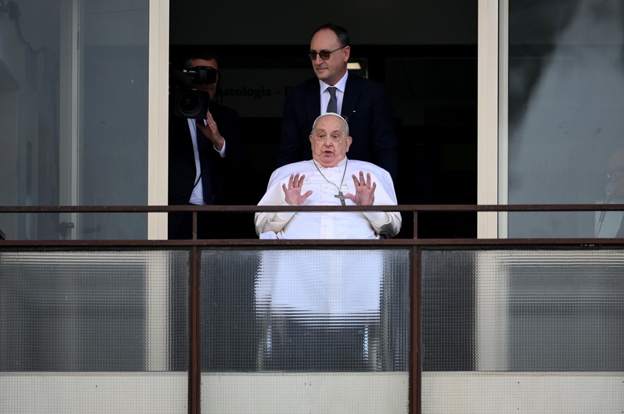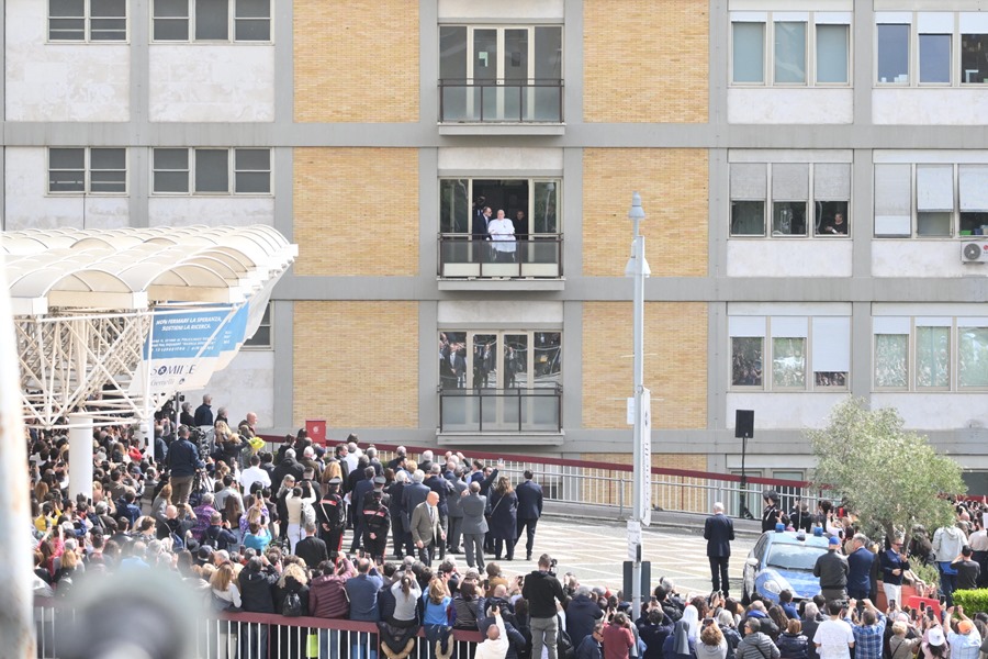 Primera aparición pública del papa Francisco en el hospital Gemelli de Roma tras recibir el alta. EFE/EPA/ETTORE FERRARI