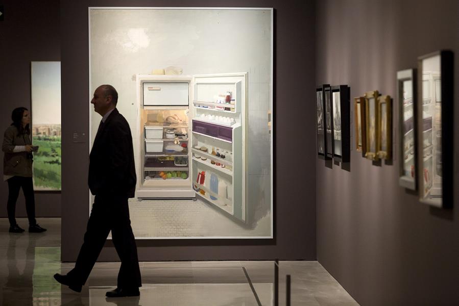 Un hombre camina junto al cuadro “Nevera nueva” del artista Antonio López, en un exposición temporal del Museo Carmen Thyssen de Málaga. EFE/Daniel Pérez